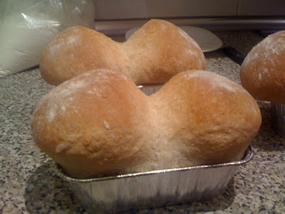 - Engrasar los moldes y formar bolas de masa. El peso de las bolas dependerá del tamaño del molde en el que vayamos a hornear el pan. Dos bolas de 200 g cada una para un molde mediano de unos 20 X 7 X 10 cm. Nosotras teníamos unos moldecitos pequeños en los que pusimos esta cantidad de masa y "se nos desbordó". Ya antes de introducirlos al horno pudimos comprobar que pusimos demasiada cantidad de masa y, efectivamente, al hornear, aquello empezó a crecer de forma incontrolada. Para un molde más grande, yo optaría por una tercera bola de 200 g.