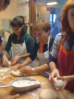 Los panes de molde que hicimos iban desde un sencillísimo pan de molde típico inglés (el que Ibán puso en su blog en fecha previa al curso), pasando por un pan de mie o pan de molde "canónico", para llegar a un pan de leche de Hokkaido que no llevaba nada de agua sino nata, leche y huevo como elementos líquidos. Los que ya estáis aficionados al pan ya sabréis todo lo que esto implica, amasado, fermentaciones, boleado, etc. Allí estuvo Ibán ayudando a todos y explicando un montón de cosas.