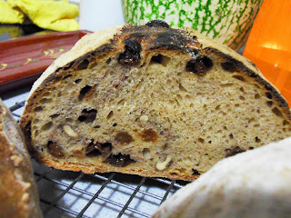 Bueno, pues del taller de pan me he animado a hacer dos recetas de pan: el pan rústico y el pan integral de trigo con pasas y nueces. En la foto de arriba podéis ver el resultado de los panes de hoy. Dos kilos y medio de pan que no me van a durar nada. En el taller lo hicimos con albaricoques secos pero, tenía encargado para una compi un pan de pasas y nueces, con lo que cambié un ingrediente por otro.