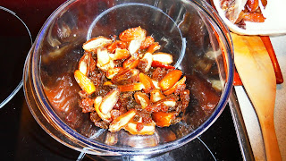 - El glaseado de mermelada lo haremos de la siguiente forma: Ponemos en el vaso, el brandy escurrido del macerado de las frutas secas y la mermelada de ruibarbo. Programamos 3 minutos a 100º C veloc 4. Lo vertemos en un bol y reservamos