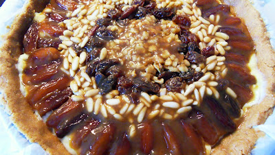 - Por último hacemos la decoración de la tarta: En círculos concéntricos (unos dentro de otros) vamos colocando desde el exterior del molde hacia el centro en este orden: dátiles, piñones, pasas y las nueces picadas.