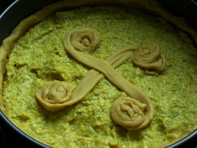 - Vertemos el relleno de puerros preferiblemente frío y hacemos un adornito con la masa sobrante. Le hice un lauburu (cuatro cabezas) enrollando unas tiras de masa
