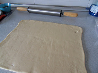 Espolvoreamos harina sobre la superficie y con ayuda de un rodillo (al que también le pondremos un poco de harina) comenzamos a estirar la masa. Mucha paciencia. Hay que llegar a obtener un rectángulo de unos (40 x 30 cm) aprox.