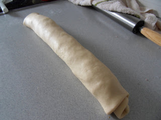 Untamos el dedo con agua y lo pasamos sobre el borde inferior de masa que está libre de relleno y comenzamos a enrollar el pan. No es necesario hacer fuerza sino, simplemente enrollarlo.