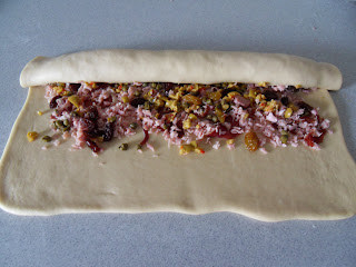 Ojeando, encontré un pan con masa dulce relleno de jamón, aceitunas, pasas y alcaparras y como han sido las fiestas de mi pueblo (Erandio, Bizkaia) pensé en llevarlo como aperitivo para la comida familiar del sábado.