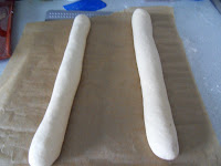 - Después, se saca la bola del bol a una superficie enharinada. Se aplana suavemente la masa y se corta en dos trozos. Se les da forma de bola suavemente y se dejan 5 minutos de reposo. Se forma una barra alargada con cada una de las bolas estirando hasta obtener una barra de unos 40 cm de largo