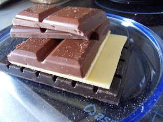- 390 g de chocolate en trocitos. Puede ser de un tipo ó de 2 ó de 3 (cobertura, blanco y 70% cacao) como más os guste