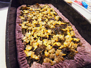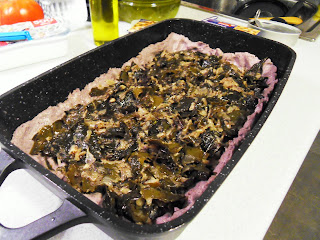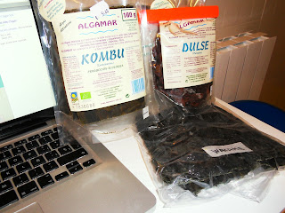 Bueno, tenía muchas ganas de probar esta receta aunque para la masa quería la de la "empanada de millo". Desconozco el mundo de las algas pero, no sé exactamente por qué, es un alimento que me atrae bastante. Las he probado en algún restaurante chino o japonés pero, ya tenía ganas de cocinar con ellas. Si alguien cree que las algas son como las verduras, que sepa que se equivoca. Yo las compré desecadas y al cocinarlas no quedan nada saladas y tienen una textura y un sabor muy agradable. Además, como ya se cultivan en Galicia no es necesario exportarlas con lo que no se trata de un producto caro. Si están desecadas tienen buena conservación, no huelen y cunden muchísimo (20 gramos de alga desecada equivaldrían aproximadamente a unos 200 g de algas frescas).