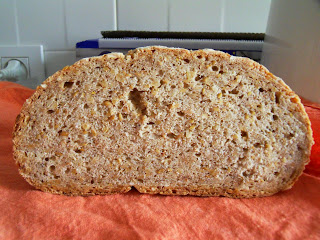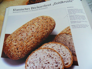 Hoy os traigo un experimento que se llama algo así como "Klassisches Dreinkornbrot Goldkruste" y que me he tomado la libertad de cambiar y adaptar a los ingredientes disponibles aquí. Evidentemente, la receta está en alemán. O sea, que la traducción ha sido a golpe de diccionario puro y duro, consultando algunas páginas y preguntando a Ibán.