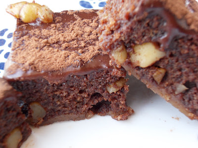 Incorporar la harina y el cacao tamizados, las nueces partidas y, por último las claras a punto de nieve. Mezclar suavemente y verter en un molde de 20 x 30 cm forrado con papel de hornear (es lo que dice la receta, yo he usado uno de pirex de unos 24 x 24). Hornear 20 minutos, sacar y enfriar sobre una rejilla.