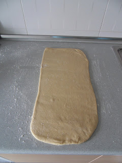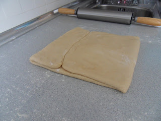 Sacaremos la masa a una superficie ligeramente enharinada. Ahora estiraremos la masa hasta obtener un rectángulo de un espesor de unos 3-4 mm.