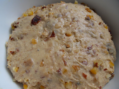 En un bol ponemos todos los ingredientes de la masa y comenzamos a amasar hasta obtener una masa lisa. Esta masa es de las pegajosas y complicadillas de manejar pero, se puede utilizar la técnica del amasado francés. Cuando ya tenemos una masa lisa, la extendemos un poco sobre una superficie y añadimos todo el macerado de frutas. Cuando ves todo el mogollón de frutas sobre la masa te parece que va a ser del todo imposible conseguir integrarlas con ella. Pero, con paciencia y ayuda de la espátula se puede conseguir. Otra cosa. Si véis que la masa se vuelve extremadamente pegajosa en algunos momentos es conveniente dejarla un par de minutos en reposo. Ciclos de amasado y reposos (yo he hecho 3 reposos de unos 2-3 minutos) para facilitar el proceso de amasado. Y no olvidéis la paciencia.