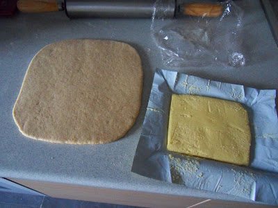 Estiramos la masa de croissant sobre una superficie ligeramente enharinada formando un cuadrado. Ponemos la mantequilla en el centro. Envolvemos la mantequilla formando un paquete y cerramos bien. Dejamos el cierre hacia arriba.