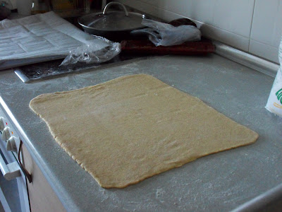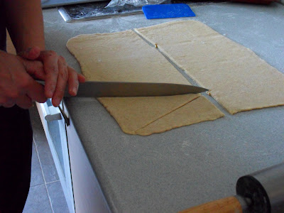 Tras sacarla y estirarla, le he doblado para hacer un plegado doble y la he dejado una hora en la nevera. Seguidamente, he extendido la masa con el rodillo hasta que tenía un espesor de unos 4 mm y la he cortado en triángulos tal y como véis en la foto.
