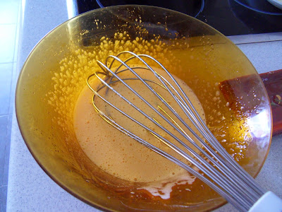 Batir las 2 claras y las 2 yemas con un batidor y, agregar luego la otra yema y batirla también. Incorporar después, poco a poco, el azúcar batiendo sin cesar hasta conseguir que el azúcar quede completamente disuelto.