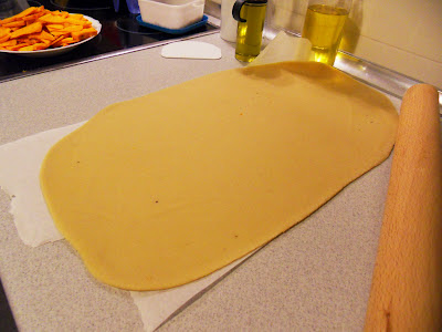 Una vez estirada se espolvorea la mitad superior (los bordes no) con la mezcla de azúcar y canela y encima ponemos un chorrito de aceite de oliva. Sobre esto ponemos la calabaza a la que también echaremos la mezcla de azúcar y canela y también, aceite de oliva. El azúcar y el aceite según vuestro gusto.
