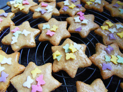 Preparamos el glaseado: mezclamos los 80 g de azúcar glace y las 3 cucharadas de zumo de limón añadiéndolas poquito a poquito. Queremos una glasa espesa. Bañamos las galletas en la glasa y espolvoreamos estrellitas de colores o maripositas como en este caso.