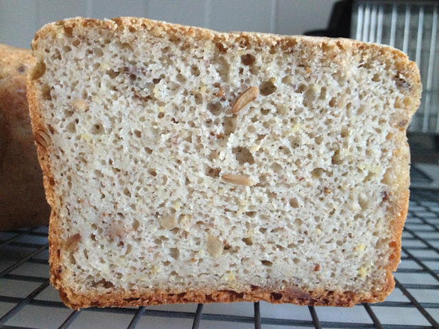 La masa madre de arroz se porta fabulosamente. He descubierto que le gusta el calorcito y que a 26-30º C se encuentra a las mil maravillas. Y del resultado ¿Qué decir? Hemos mejorado mucho con respecto al anterior pan sin gluten de maíz pero hay que seguir trabajando en ello. Por el momento estoy muy esperanzada a la vista de los resultados.