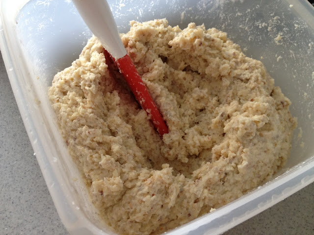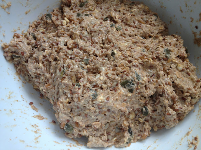 Mezclamos las harinas, féculas/almidones, las lentejas, alcaravea y lino molidos y la sal. Añadimos las pipas tostadas, la cucharada de aceite de oliva restante y el agua. Mezclamos todo bien. Queda como la masa de un bizcocho.
