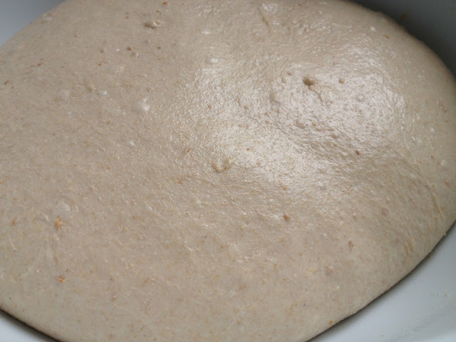 A los 60 minutos de haber comenzado esta 1ª fermentación ya la he podido coger con las manos mojadas en el aire y le he dado 6 golpes muy suavitos (suaves ¿eh?, que nadie se anime a darle porrazos a la pobre masa) de amasado al estilo francés dentro del bol. Es una masa gustosa, infladota y húmeda. Un gustazo.