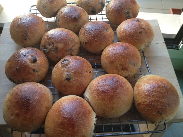 Introducimos en el horno y los dejamos unos 14 minutos vigilando para que no se doren demasiado. Antes de terminar el horneado los he cubierto con papel de aluminio. Si no, peligraba el "moreno" de los bollos.