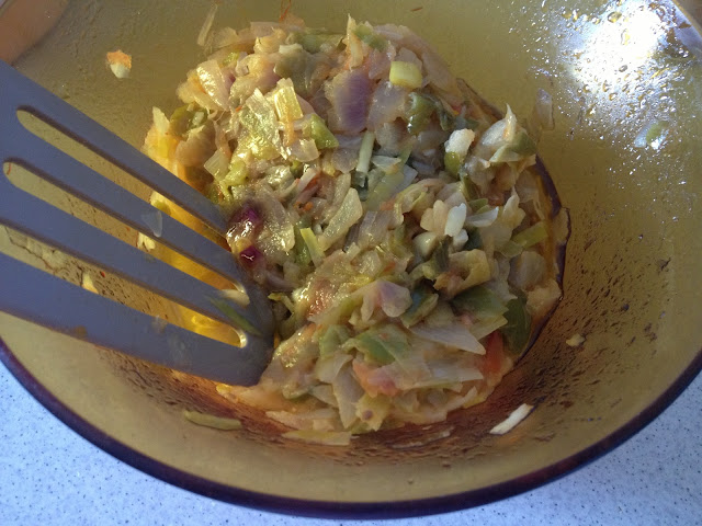 Por la mañana he elaborado el sofrito para que el aceite y el jugo estuvieran fríos a la hora de preparar la masa. En el vaso de la thermomix he picado las verduras (cebolla, puerro y pimiento verde) durante 5 segundos a velocidad 5. He echado el aceite y he programado 8 minutos a 100º C, velocidad cuchara. Después he añadido el tomate y las hebras de azafrán y lo he programado a misma velocidad y temperatura otros 5 minutos.