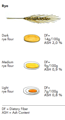 | Harinas de centeno según su grado de extracción. Dark rye flour (harina integral de centeno) en la que se muele el grano completo. Medium rye flour (harina semi-integral de centeno) en la que se muele el endospermo y parte de las cubiertas exteriores. Light rye flour (harina blanca de centeno) en la que se muele únicamente el endospermo. Leyenda: DF = Dietary Fiber es la Fibra Dietética y ASH = Ash Content es el Contenido en cenizas. |