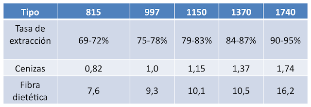 Las especificaciones para cada tipo de harina serían más o menos las siguientes: