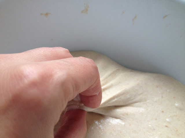 A los 60 minutos de haber comenzado esta 1ª fermentación ya la he podido coger con las manos mojadas en el aire y le he dado 6 golpes muy suavitos (suaves ¿eh?, que nadie se anime a darle porrazos a la pobre masa) de amasado al estilo francés dentro del bol. Es una masa gustosa, infladota y húmeda. Un gustazo.