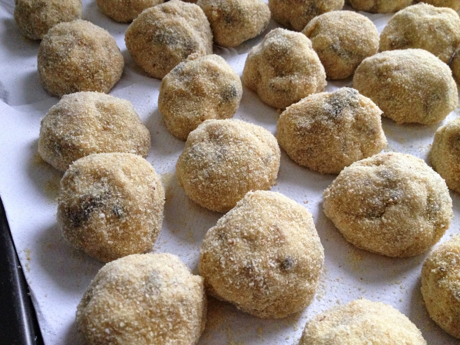 Al día siguiente, sacamos la bandeja y formaremos las croquetas con aceite de oliva. Berasategui recomienda hacerlo así y no pasarlas por harina. Yo he formado bolas porque me parece lo más fácil. Las coloqué en una bandeja metálica y las cubrí con film transparente. Una vez formadas, las introduciremos en la nevera durante un mínimo de 2-3 horas.