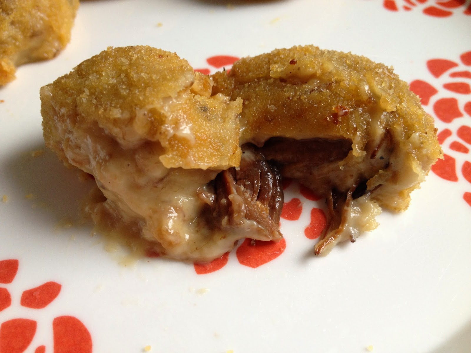 Tengo que comentaros una cosa: El rebozado es fantástico y a prueba de bechameles blanditas. Mi masa había quedado más ligera de lo que me hubiera gustado, pero al freír las croquetas el rebozado ha aguantado estupendamente. El interior de la croqueta es supercremoso y con ese toque gelatinoso de la carne de rabo guisada. Una delicia.