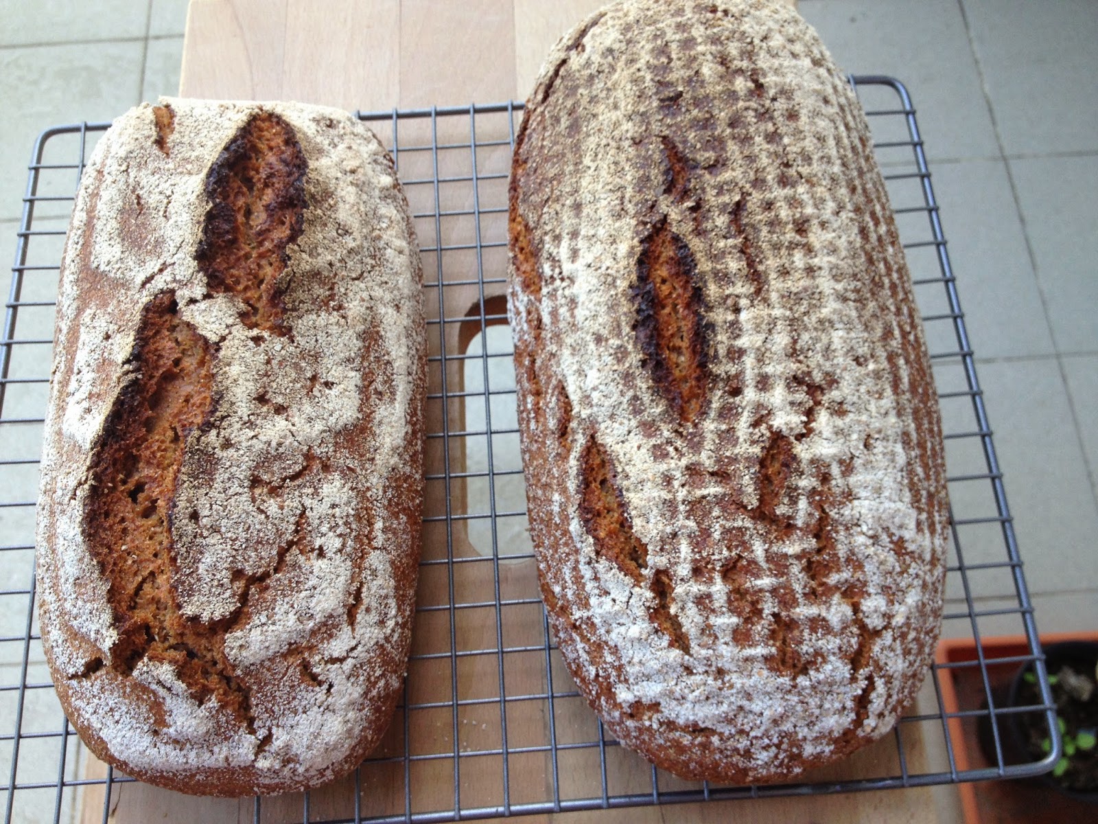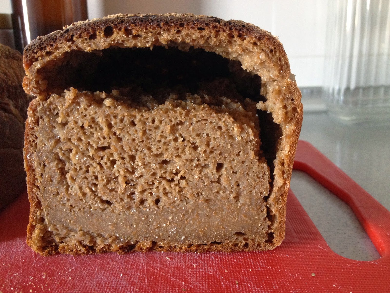 Esta receta del Vollkornmischbrot está basada en una de las recetas del tercer libro de la colección "Deutschland Brotland" de Franz Josef Steffen. La receta original es 100% integral. Pero, yo he sustituido parte de la harina de centeno integral por harina blanca de centeno. ¿Por qué? Como mi centeno en grano cogió humedad durante unos meses que estuvo almacenado donde no debía, se activaron sus mecanismos enzimáticos y la harina integral molida de este grano se comportaba de manera inusual dando panes gomosos y con grandes cavernas (fenómeno popularmente conocido como "starch attack". Ver imagen un poco más abajo). Por este motivo es por lo que lo he mezclado con harina blanca de centeno para intentar equilibrarlo un poco.