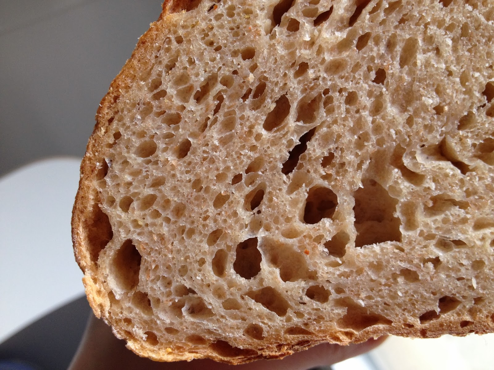 La masa madre tenía un olor entre dulzón y agrio que me ha gustado mucho. Me ha dado un buen pálpito. Es que, no sabéis cuántos disgustos me he llevado en los últimos meses. Para los que no sepáis qué es un "starch attack" os pongo una imagen para ilustrarlo. ¿Véis la parte baja del pan que parece como un pegote? ¿Y qué me decís de la "peazo" caverna? Ja, ja, ja. Pues si veis qué cara se me quedó a mí. Te da rabia, porque hasta que cortas el pan, has echado un montón de horas de preparaciones e ilusión y te quedas como una boba mirando sin comprender qué puñetas es lo que ha podido pasar.