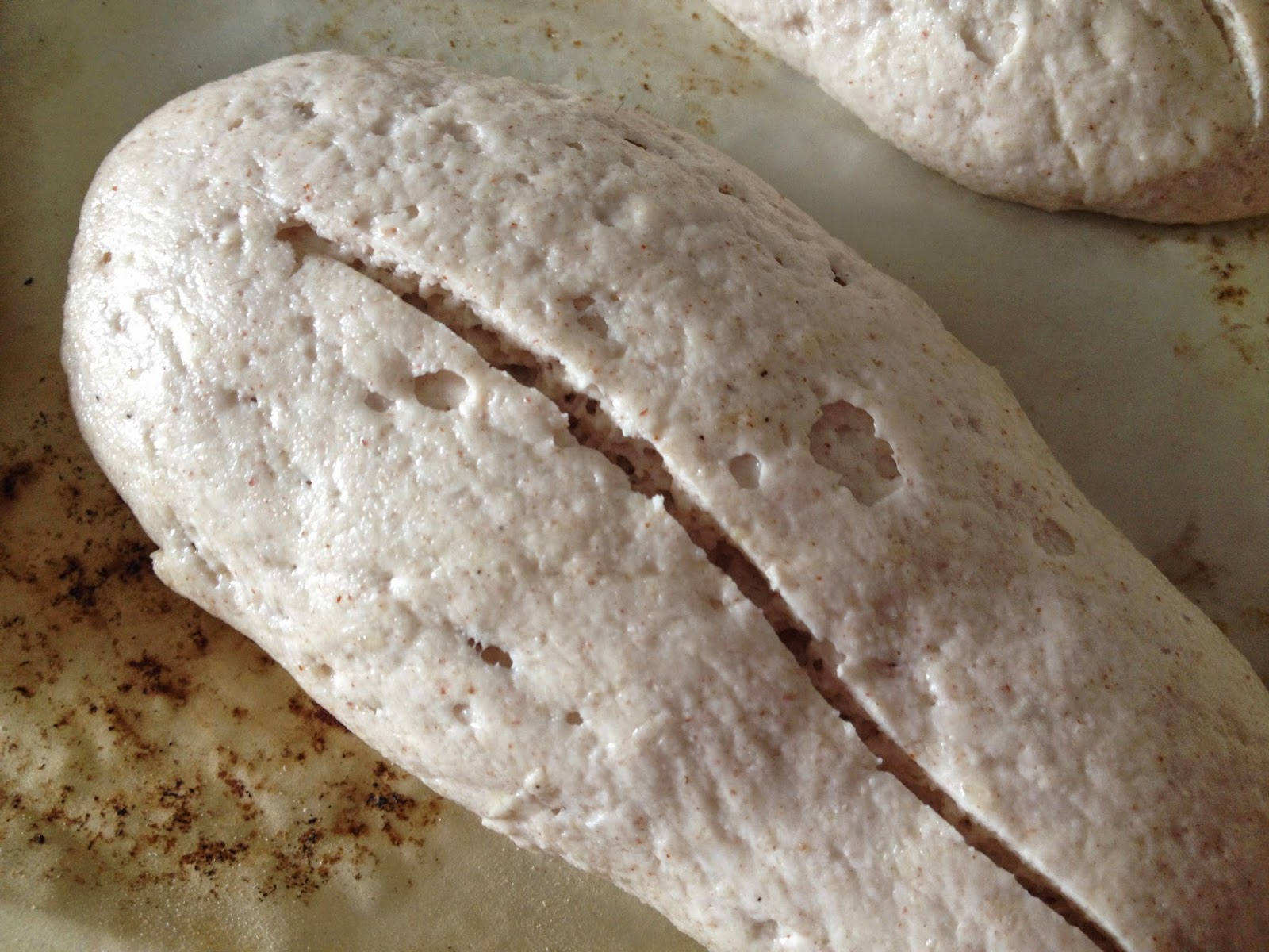Con las manos untadas de aceite cogemos la masa, la aplastamos formando una bola que seguiremos estirando para formar una barrita. Las depositamos en una bandeja forrada de papel de hornear y las dejamos fermentar unas dos horas (19º C) tapadas con un trapo de algodón/hilo.