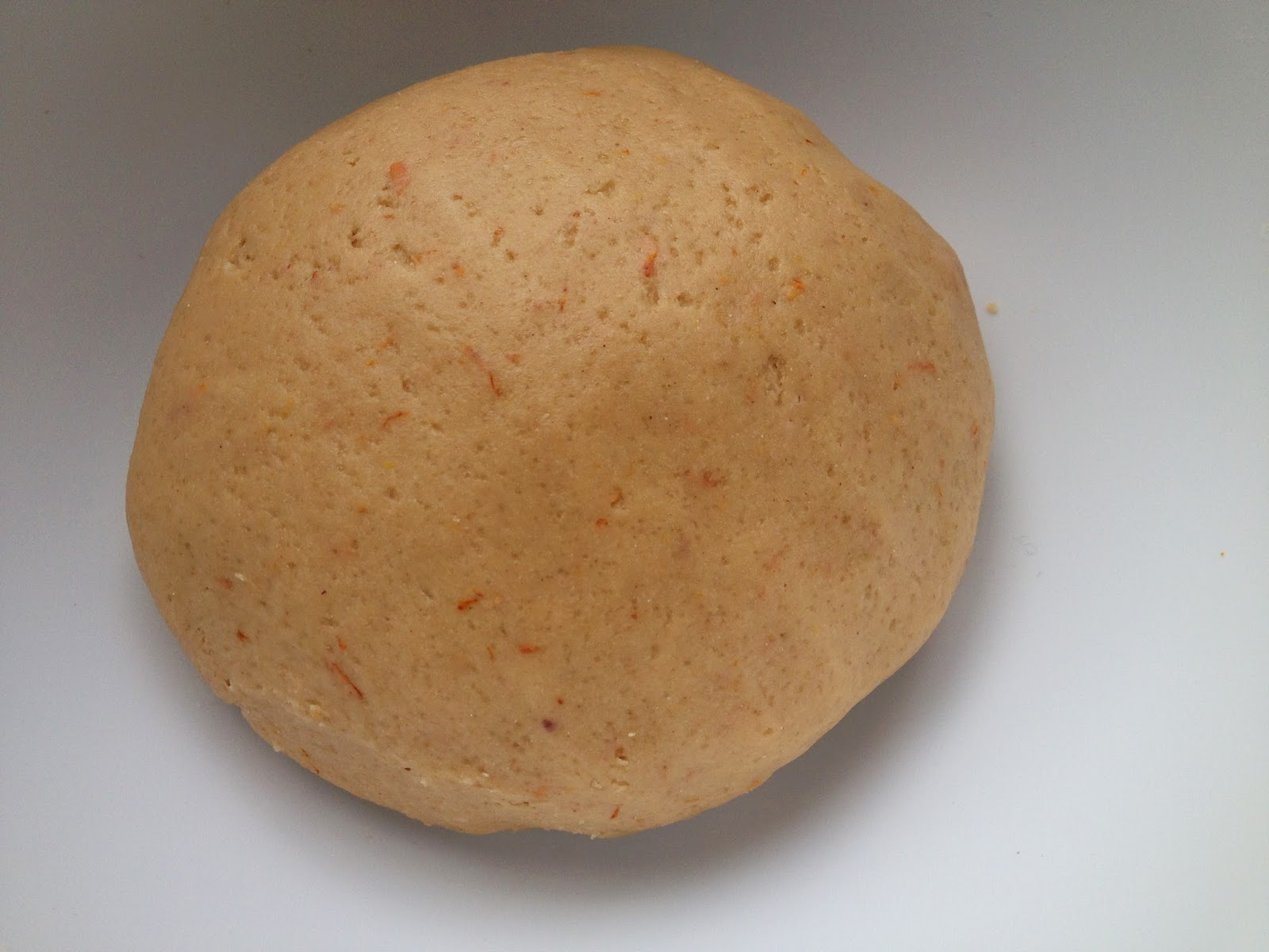 Batir el zumo, los huevos y la ralladura de naranja. Incorporar 550 g de la mezcla de harinas que teníamos reservada, el azúcar y el aceite de oliva sin dejar de remover hasta obtener una masa homogénea. Le damos forma de bola con las manos. Esta masa se trabaja de cine y la tapamos con un paño/gorro de ducha y reservamos durante una hora aproximadamente.