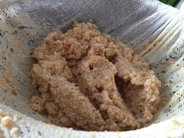Colamos una primera vez sólo con el colador para quitar el residuo mayor. Entonces lavamos un poquito el colador y colocaremos una gasa colando la bebida una segunda vez para quitar el residuo más fino. No tiréis el bagazo (el resto que queda tras el triturado) y guardadlo en un frasquito de cristal con tapa en la nevera.