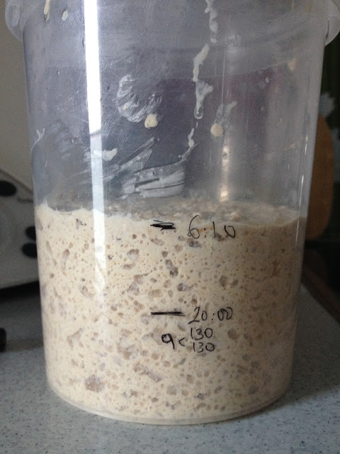 - 2º refresco: Desde las 20:00 del viernes hasta las 06:00 de la mañana del sábado. Proporciones 1:14:14. Con 9 g de la MM anterior + 130 g de agua + 130 g de harina de avena. La podéis ver en la foto de abajo en el momento en el que estaba lista :-)