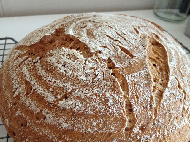 Todavía estoy que no me lo creo. Si hace un año me dicen que iba a conseguir un resultado así con un pan sin gluten, habría respondido que ni de coña. Pero, desde que estoy "explotando" el potencial de mi masa madre sin gluten, sólo me llevo alegrías. Y aquí una prueba de lo que os estoy contando. Lo único que lo estropea un poco es una grieta en la parte superior y que se ha aplastado en la base (los defectillos estéticos, en la foto de abajo). A pesar de no ser la "entrada perfecta" he decidido publicarlo porque estoy convencida de que la semana que viene me va a salir perfecto y quería dejar constancia en mi cuaderno de laboratorio :-D