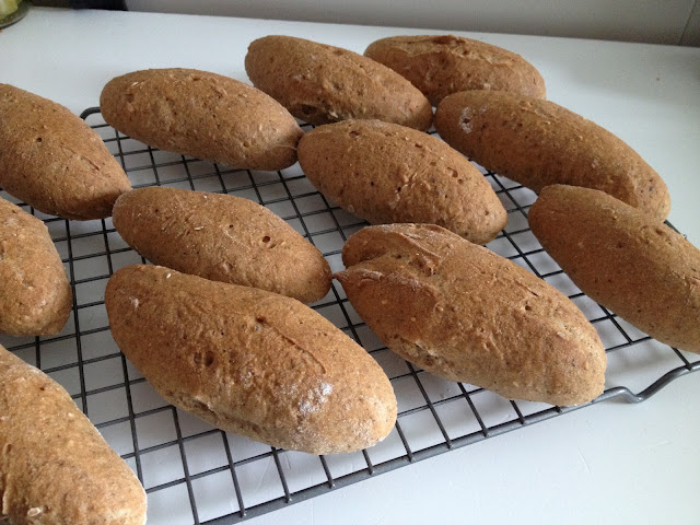 Con lo que comentas de no mezclar gelificantes/emulgentes estoy de acuerdo (yo no lo llamaría manías) ya que me resulta difícil imaginar el efecto combinado de varios de ellos, aunque por la experiencia de otros blogueros/foreros veo que la combinación es posible y exitosa. Yo aún sólo he probado a combinar psyllium y chía o psyllium y lino. Me gustan ambas y creo que mejoran mucho el contenido en nutrientes además de ese efecto buscado de que "soporte y sujete" nuestros panes. Mira si no, qué majos quedaron estos panecillos con la chía y el psyllium. Hoy he sacado otro del congelador; espectacular. Sólo pierden el carácter crujiente por decir que pierden algo. De sabor están muy buenos y hoy con el pisto me ha dado pena no haberme llevado dos para poder untar más.