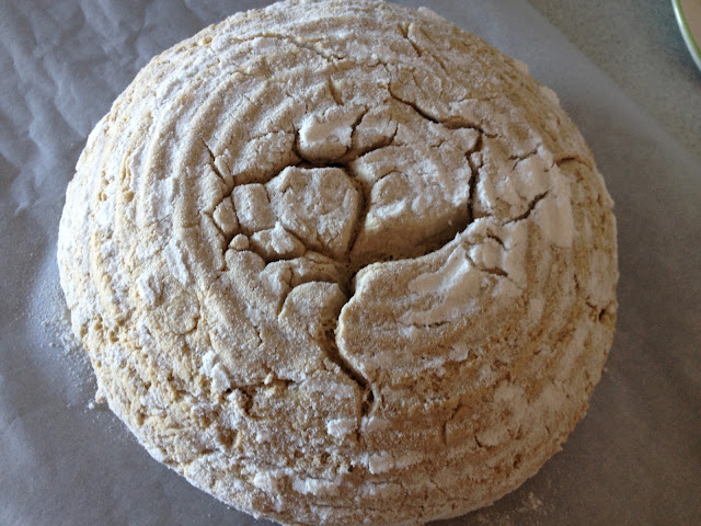 Formado: Sacamos la masa sobre una superficie enharinada con harina de arroz. Formado suave, no hace falta que quede una bola de superficie lisa y no importa que se rompa la masa (ver la foto del banetón un poco más abajo) y la dejamos en un banetón tapado durante 1 hora aproximadamente.