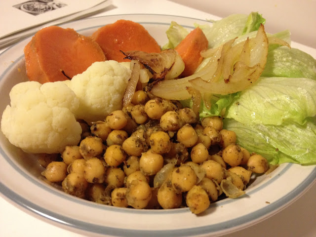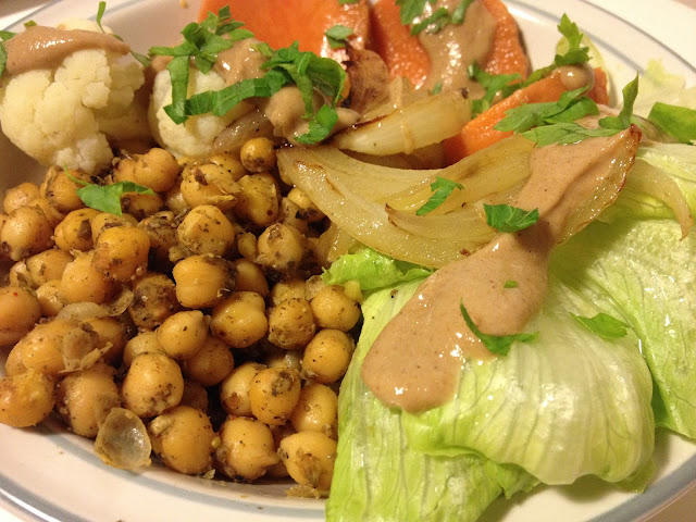 En un plato hondo colocamos las verduras como nos apetezca. Añadimos un tercio de los garbanzos especiados y aliñamos al gusto.