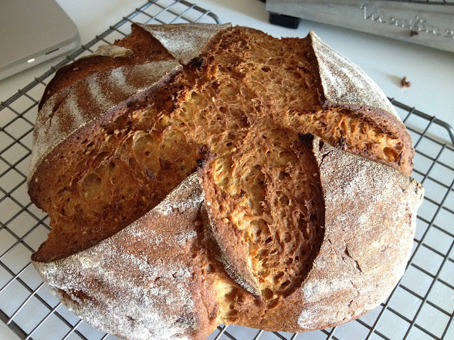En este caso lo he hecho únicamente con masa madre de arroz (con una hidratación del 100% y alimentada con harina semiintegral de arroz). Más abajo indico los pasos que seguí para refrescarla. No he añadido levadura fresca. Para este pan he tratado también de aprovechar la calabaza de nuestra cesta de verduras. Pan invernal total y de temporada.