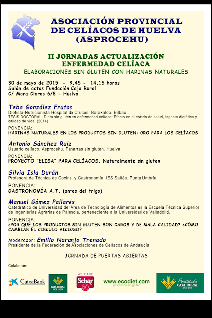 Además tengo del orgullo de invitaros a las próximas jornadas de actualización de enfermedad celíaca que se se celebrarán el próximo sábado 30 de mayo en Huelva. He tenido el inmenso honor de que me pidieran que hablara de harinas sin gluten y en cuanto me lo propusieron, a pesar de tan lejos de mi casa, acepté encantada. Así que la dietista se va hasta la otra punta del mapa para difundir conocimiento y salud.