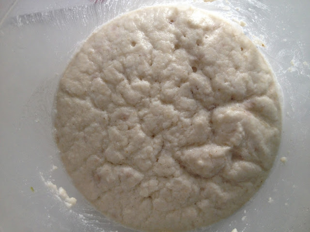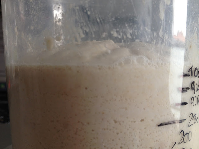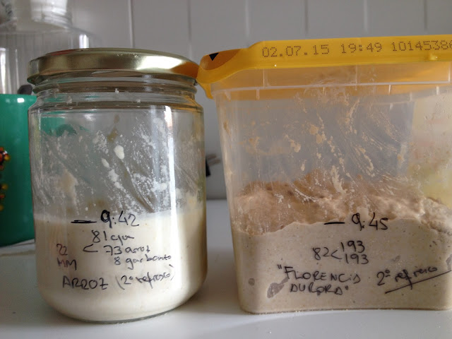 Quise repetir el pan de la semana anterior pero esta vez con masa madre de arroz a ver si me reconcilio con aquel intento de pan "limón". Con lo bien que íbamos con mi masa madre a puntito y todo preparado, snif! En la foto de abajo están mis masas madres el sábado por la mañana. La de arroz es la de la izquierda y en cuatro horas desde el momento en el que la refresqué, ya estuvo lista. Me las prometía muy feliz.
