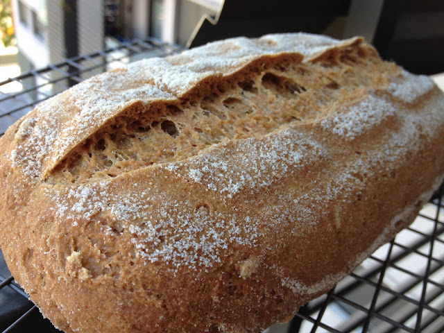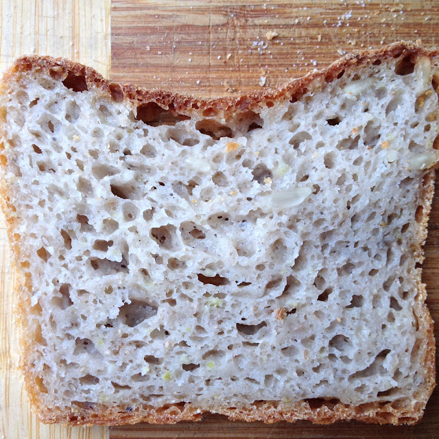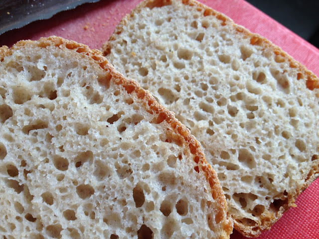 Pero, que conste en acta, que mi error más garrafal fue hacer mal el cálculo de la cantidad de agua que tenía que poner y no me di cuenta hasta que fue demasiado tarde cuando la papilla ya estaba formada. ¿Y qué había pasado? Pues que no sólo no resté la parte de agua que yo añadí con la masa madre (50 gramos), sino que lo sumé y finalmente había puesto un exceso de 100 g de agua en la receta. Es decir, que pasamos de una receta original con una hidratación del 85% al 111%, casi ná. Si sumamos el hecho de que ayer hacía calor en la cocina (unos 24º C), más toda esa cantidad de agua y el poco control "maternal" de mi masa madre, podemos entender que las alfa-amilasas descontroladas se cebaran con mi pan (que hizo la segunda fermentación en frío) y si bien aparentemente no se notaba, al cortarlo fijaos qué sorpresón está mañana al cortar el pan, je, je, je.