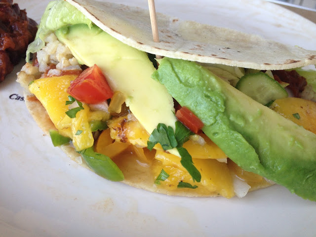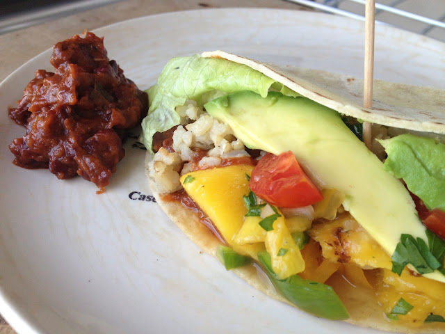 Basados en la receta original "BBQ Bean Burritos with Grilled Peach Salsa" de Thug Kitchen y con alguna adaptación. He cambiado el melocotón por mango de la receta original ya que ahora no hay melocotones. Otra posibilidad sería la piña natural que también quedaría fenomenal.