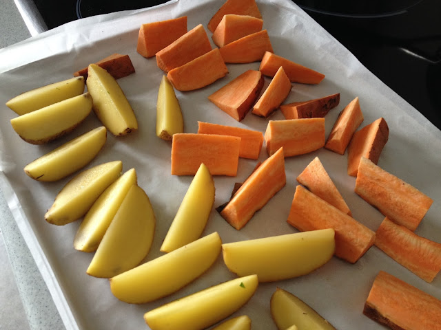 Lavamos y secamos las patatas y el boniato. Cortamos en gajos. Pincelamos la mezcla de especias y aceite sobre cada gajo y los colocamos en la bandeja.